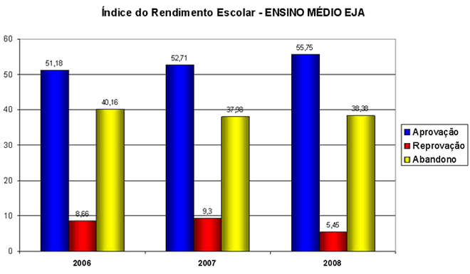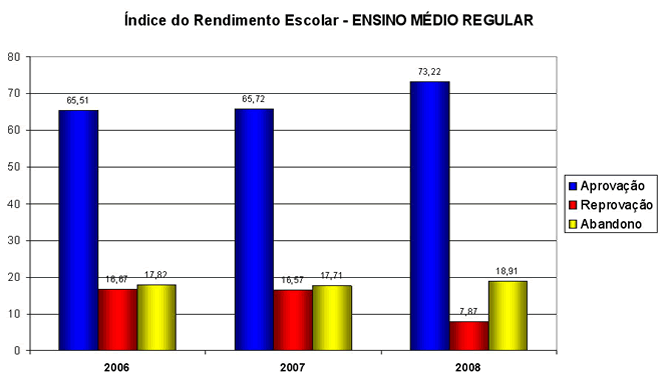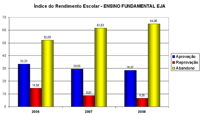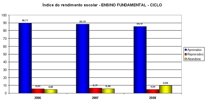 Analisando os gráficos, observa-se que os índices de um ano para o outro não diferem muito, apesar do intenso trabalho da escola no sentido melhorar os índices de aprovação através das medidas já citadas anteriormente e reduzir os índices de abandono. Os melhores índices de aprovação são do Ensino Fundamental – Ciclo, seguido do Ensino Médio Regular, que por outro lado, os maiores índices de abandono encontram-se na modalidade de ensino da Educação de Jovens e Adultos – EJA, tanto no Ensino Fundamental quanto no Ensino Médio. Toda a equipe escolar tem realizado um diálogo permanente de incentivo e motivação junto aos alunos desta modalidade, a fim de reverter esse quadro, porém o aspecto econômico acaba soando mais alto, pois a maioria dos alunos desistem devido ao trabalho, não conseguem conciliar escola e trabalho.